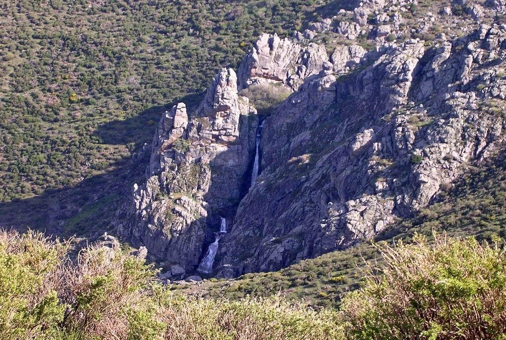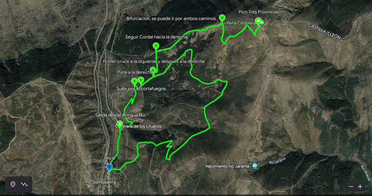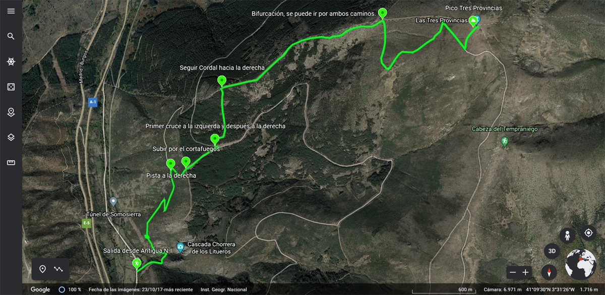 Comenzaremos nuestra ruta desde la entrada a la Peña del Chorro o la Chorrera de los Litueros, en la Antigua Nacional I. A pocos metros de empezar el camino, tendremos que cruzar dos arroyos casi seguidos, y dejaremos a la derecha la Cascada, que podremos acercarnos a verla mejor a la vuelta. Según pasamos el segundo arroyo hay que seguir por la pista forestal, que empieza a tener más pendiente. A 1,5 km más o menos tenemos que coger un camino que sale a la derecha y con una marcada ascensión hasta llegar a un cortafuegos rodeado de un pinar. Una vez llegamos al cortafuegos, hay que seguir recto unos 400 m, hasta que nos encontramos con una pista de frente y otro camino a la izquierda. Nosotros tenemos que coger el camino de la izquierda y seguir por el cortafuegos de la derecha ascendiendo hasta llegar a otra pista que gira a la derecha y que marca el límite fronterizo entre las provincias de Madrid y Segovia. Desde aquí ya podemos observar al fondo la cumbre del Pico de las Tres Provincias.